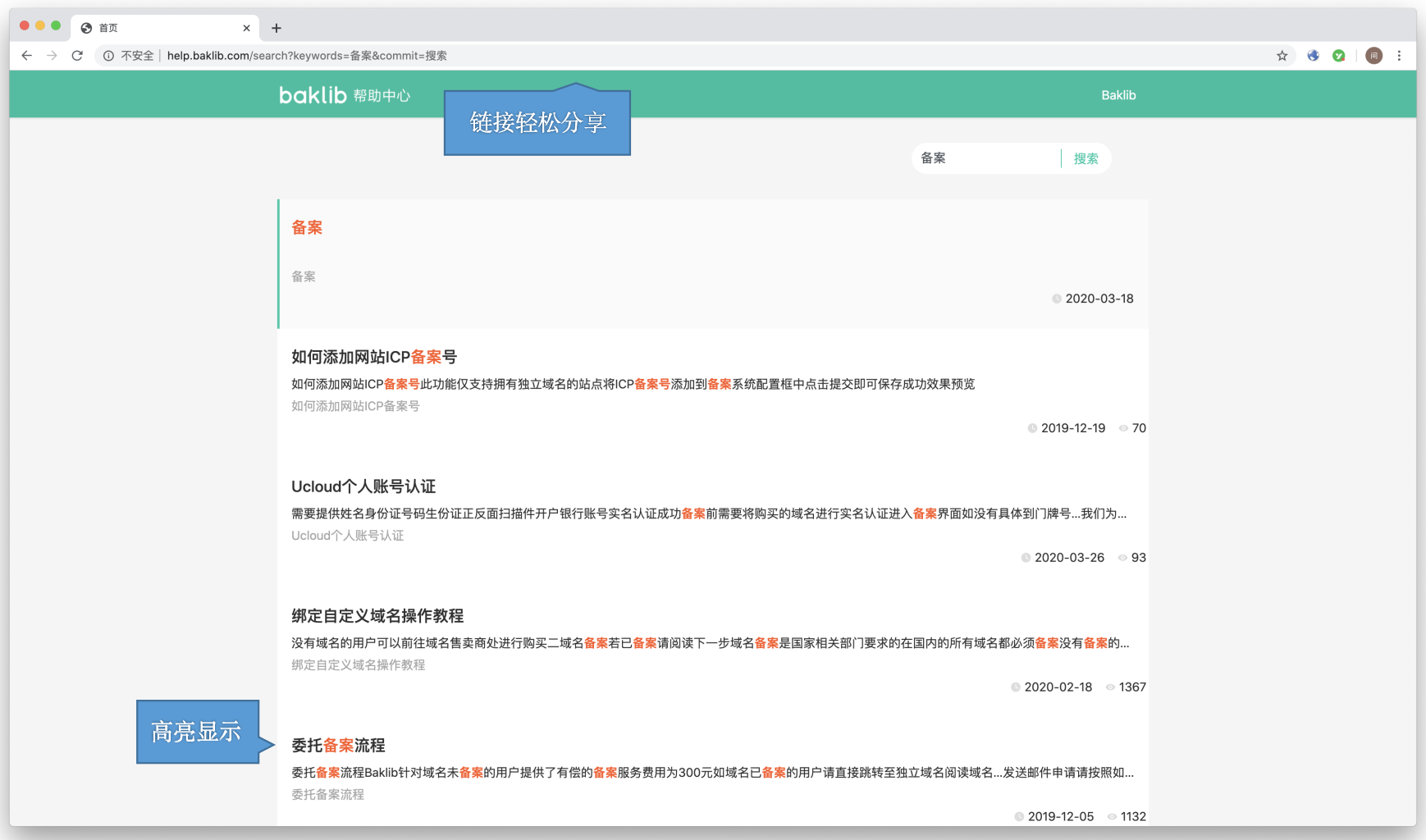 帮助中心的作用是帮助用户快速上手产品,使用Baklib制作的帮助中心能够轻易的放入到产品网站、APP、小程序中。不仅能解决APP端用户使用难题,当微信、钉钉群中有用户遇到产品使用问题时,一个链接轻松搞定用户使用难题,访问权限功能的设置做到只为你关心的用户所开放。在搜索上Baklib提供了全局检索和结果高亮的功能,帮助用户快速找寻使用难题。