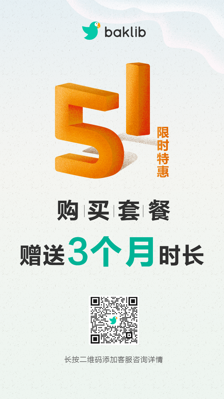 活动期间(5月1日-5月8日)凡升级Baklib套餐的站点,将额外获赠对应套餐3个月的使用时长。