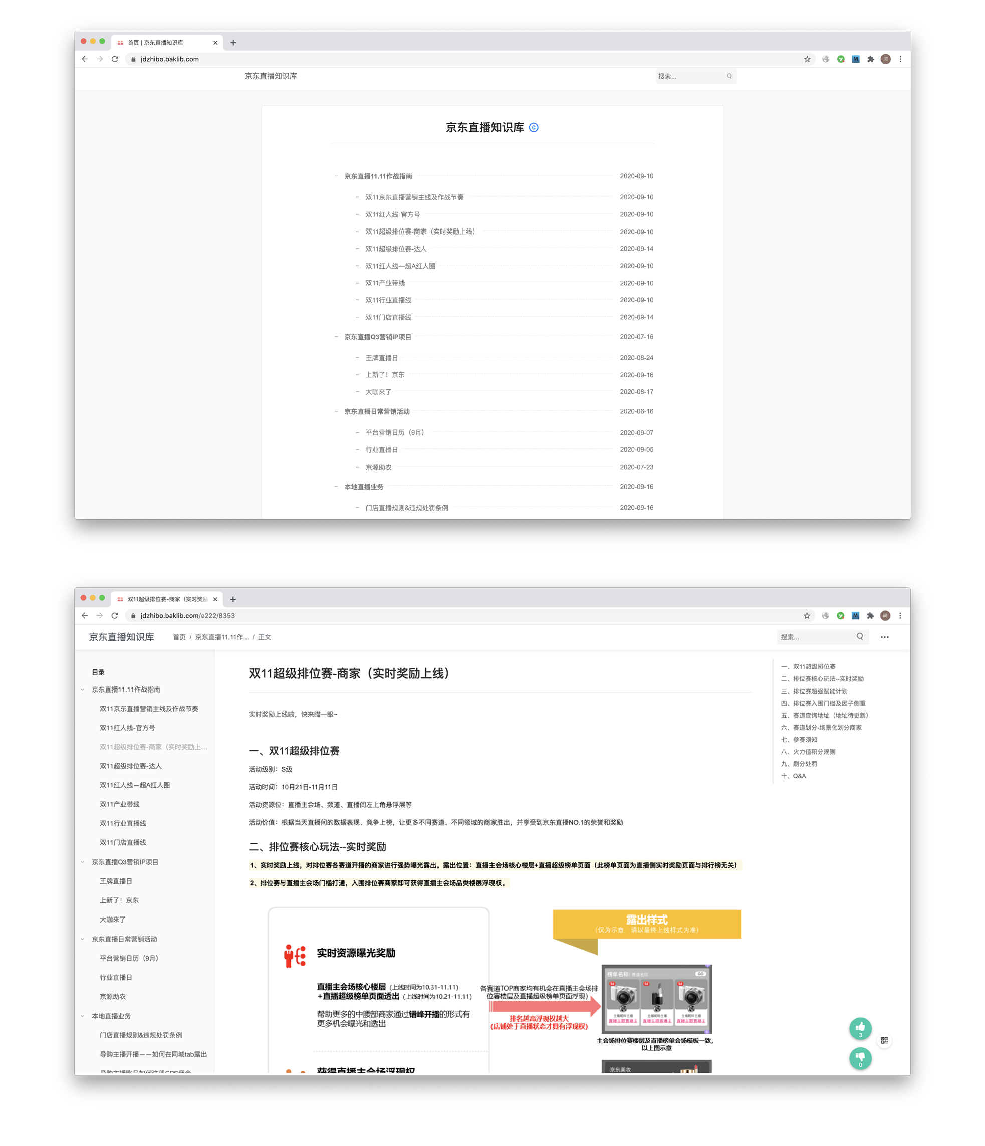 京东直播制作的帮助中心,更像是一本书,拥有书籍的目录结构,与百度相似每个页面都设置了导航与搜索框。