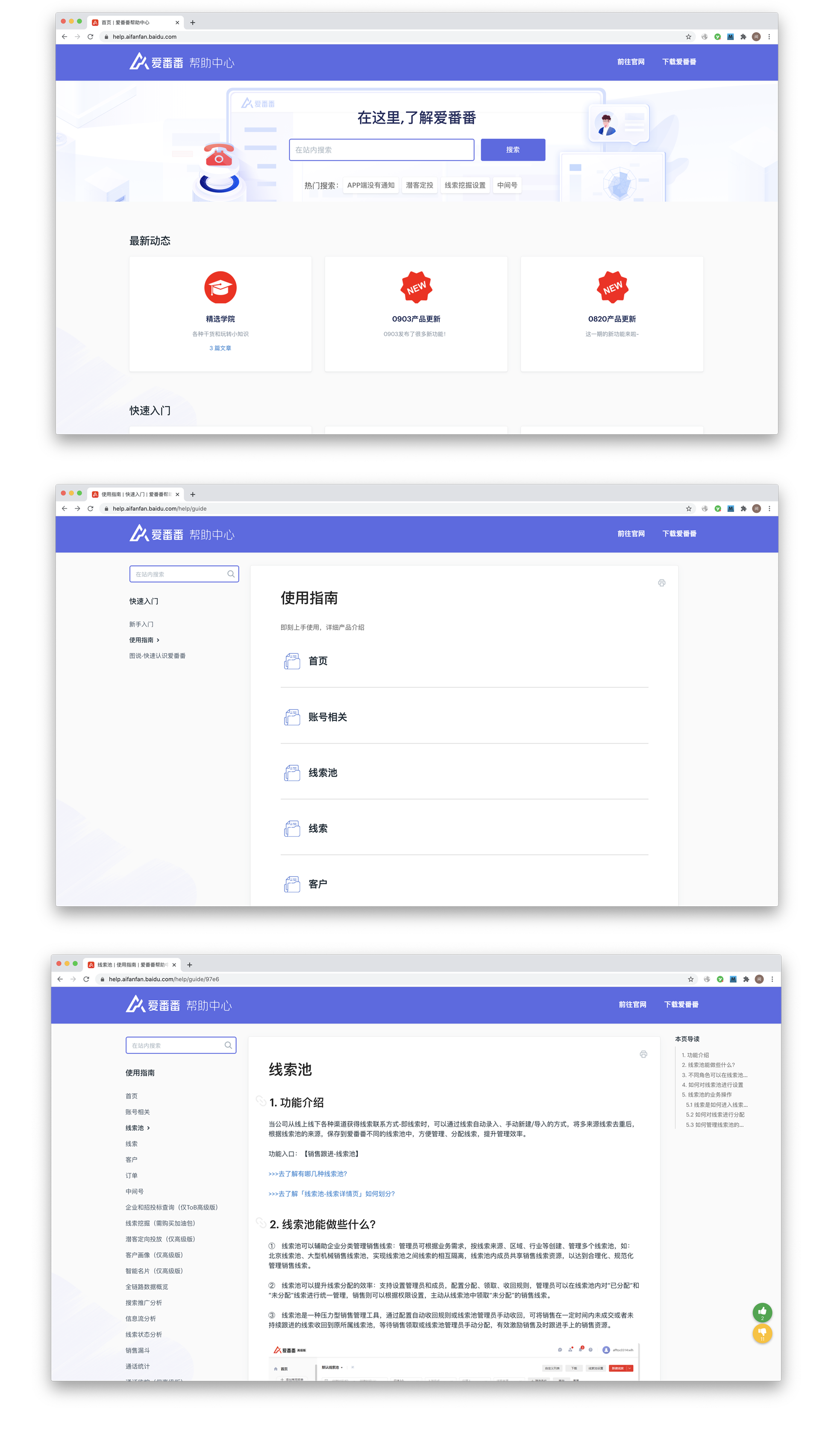 百度爱番番制作的帮助中心,从首页到最终的问题详情展示页面,结构清晰排版整洁,且每个页面都设置了导航与搜索框。大大提升用户体验!