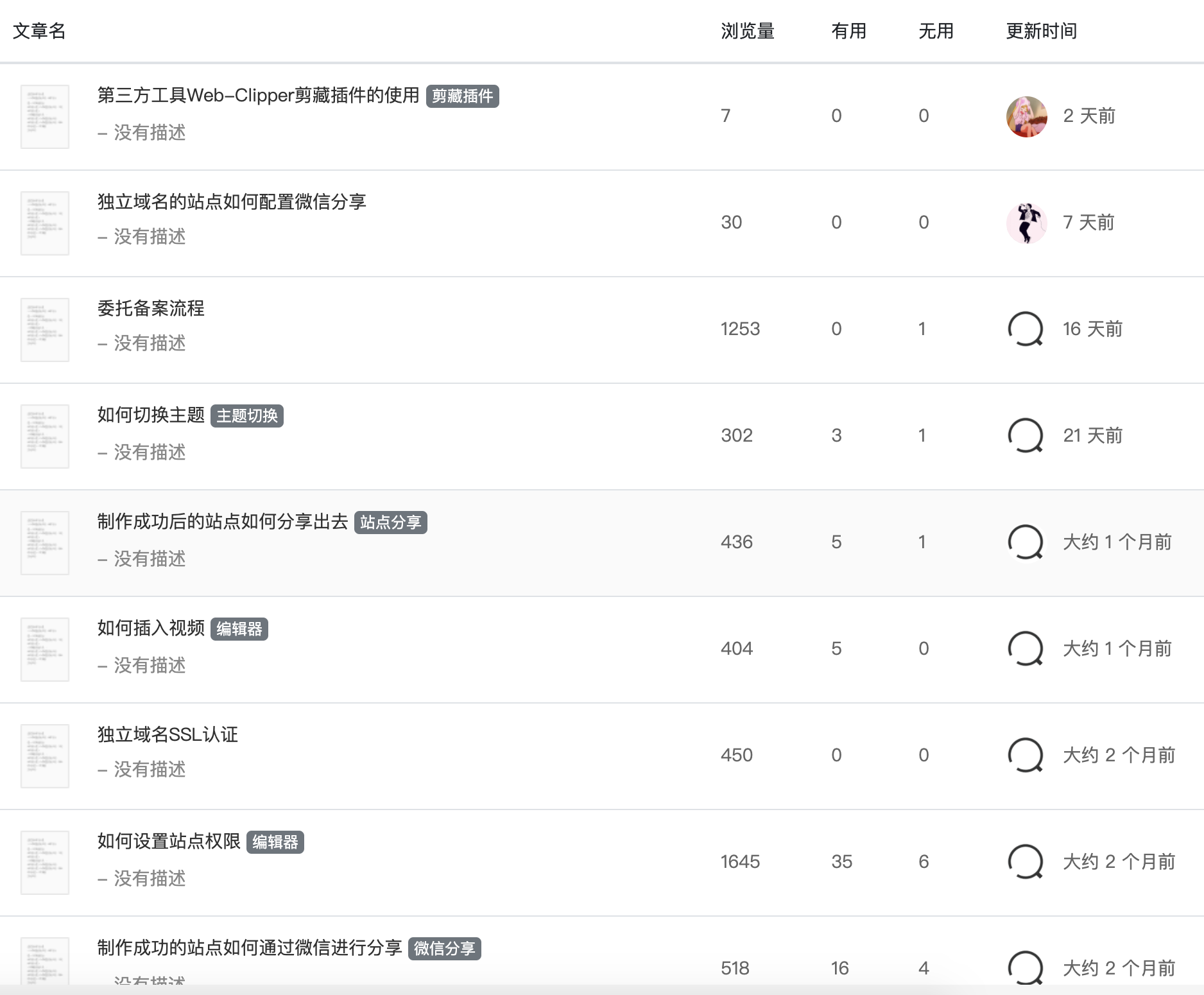 准确的数据反馈可以帮助产品方及时调整帮助页面,例如文章的阅读数量、点赞/踩的数量。设置更新时间和人员记录更方便管理!