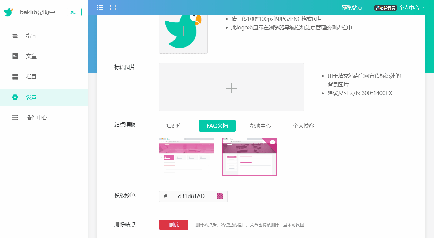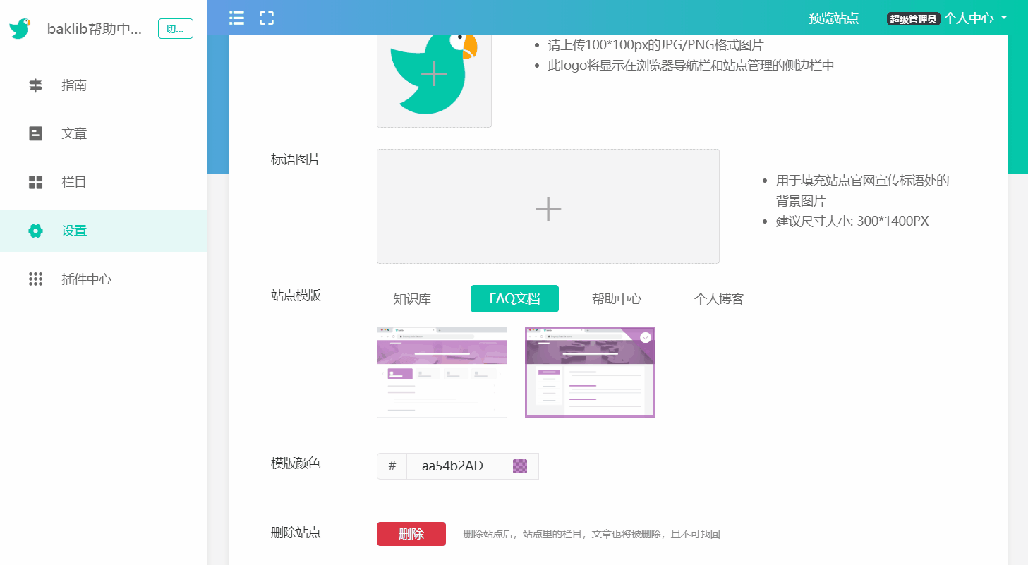 此次更新Baklib加强了对模板颜色选择的自由度,可以在站点创建和设置中调整模板的颜色,拖动色域中的颜色条选中自己喜欢的颜色。除了颜色调整外还可以调整颜色的透明度哦!