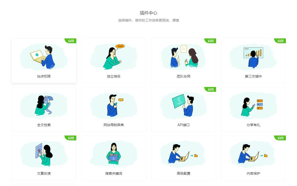 3、官方提供多种插件功能,包括:网页导航、搜索关键词统计、访客统计、独立域名等等,方便进行帮助中心的运维管理;