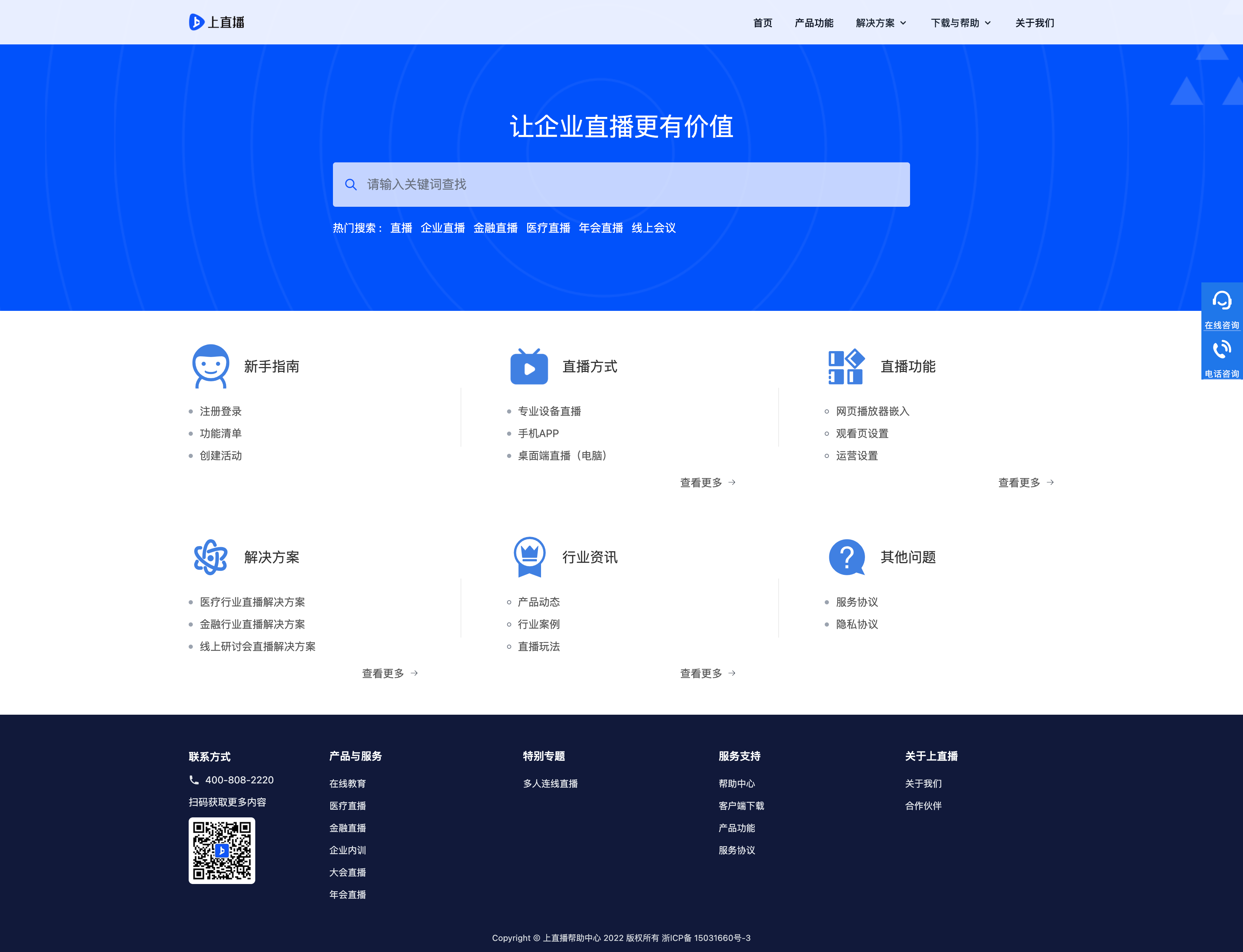 上直播是专业的企业直播服务商,旨在为企业提供从视频内容生产、内容运营、大数据精准营销于一体的完整营销闭环服务,衍生了教育培训、医疗、金融、企业内训、汽车、房产、互联网等众多行业的企业视频直播解决方案,当前已为近20万家企业提供多场景的视频直播服务,其中不乏阿里巴巴、百度、京东、国电投、链家、明基、富士胶片等众多世界500强及知名企业。