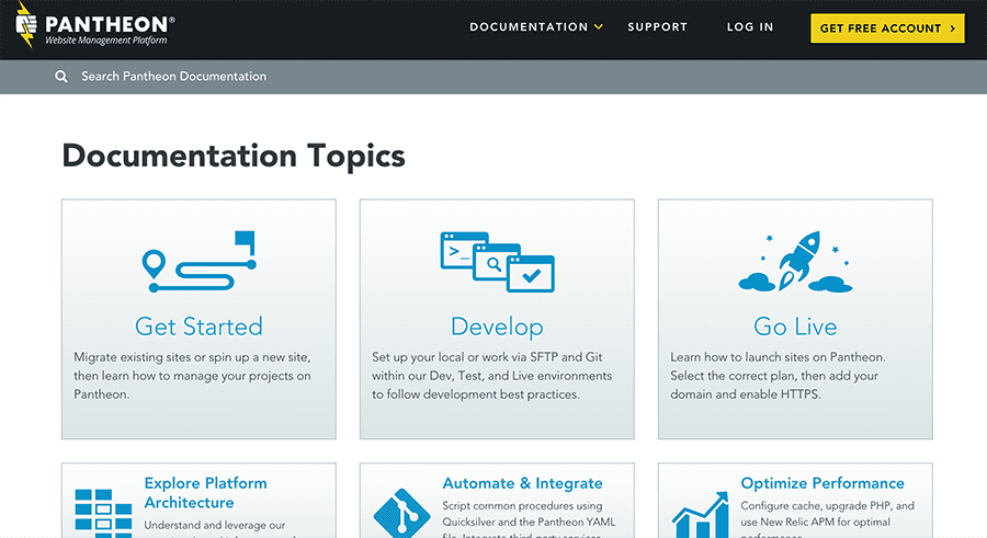网站管理平台 Pantheon 是公司投资设计其知识库的一个绝佳范例。他们摒弃了原先醒目的黑黄配色,转而采用更柔和的蓝白配色方案。保留少量原始品牌色的点缀,确保了其知识库仍然是公司品牌形象的清晰组成部分。