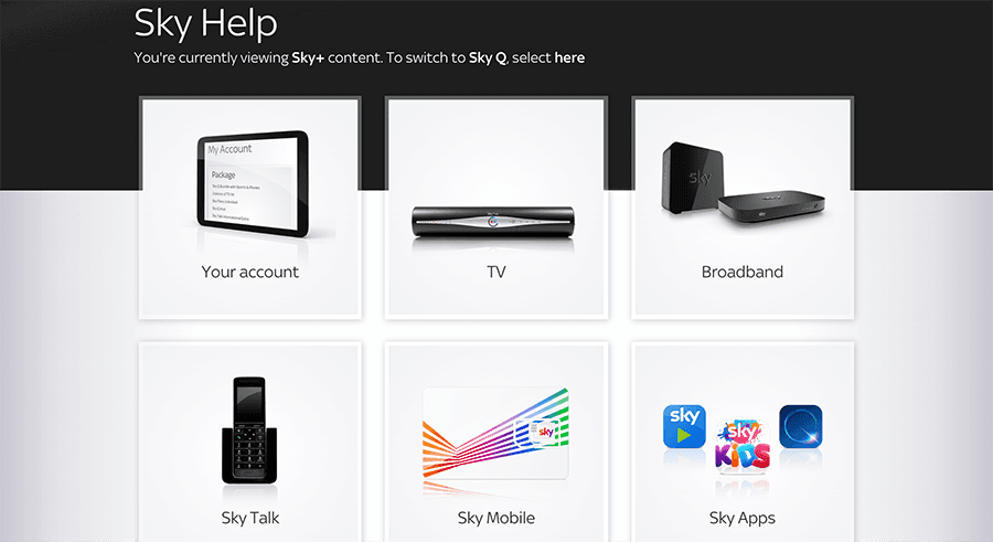 媒体公司 Sky 的客户知识库 图片使用过多,影响了真正的易用性。它看起来更像一个产品目录,而非一个有用的帮助工具。代表不同类别的电子产品照片分散了用户的注意力,使用户难以快速定位所需信息。